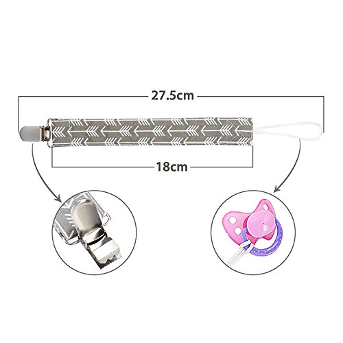-. Feature : FUNCTIONAL - Baby pacifier holder can easily attach to clothing or baby bibs and stay in place. You can use our pacifier chains with all your favorite pacifiers, teethers, soothers, toys and other baby accessories. / SAFETY FIRST - Lead-free, non-toxic, formaldehyde-free, and no aromatic amine. The metal buckle has a smooth surface without sharp edges, which can keep the baby safer. / MODERN DESIGNS - Stylish unisex patterns. Modern and neutral colors for both baby boys and girls to compliment all those cute little outfits. / HIGH QUALITY - Made of high-quality material with very soft touch and are easy to wash. They are highly durable and won't damage your baby's clothes. Each pacifier holder is 11.5 inches long (including the metal clip and loop) and 1 inch wide. / PERFECT BABY SHOWER GIFT - All experienced parents love these pacifier clips. Great to pair with our baby bandana bibs. They are also a perfect baby shower gift or sP.R.Inkle gift!