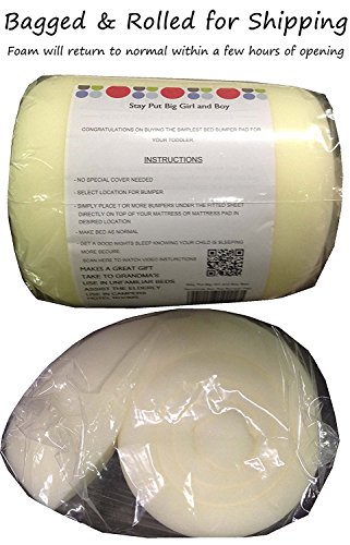 -. Feature : Is your child moving to a new bed, the Bed The Stay Put Big Girl/Boy Bed semicircle bumper pads are the perfect go between for children who have out grown their crib, but are not quite ready to sleep in a traditional bed without rolling off in the night. Use on Twin, Full, Queen or King beds, never in cribs / Sold by the piece, order one bumper pad for use on just one side of the mattress, order two or more if you need protection on multiple sides of your child's mattress. / Easy to Install - Pads are light weight and easy to install and only require placing them on top of the mattress pad and below the fitted sheet, does not require special sheets. When used correctly the unique texture of the semicircle pad keeps them where you place them and they will not move. / Easy for Children - The foam is firm enough that it is difficult for most children to rollover during sleep yet still soft enough for the child to rest their head on and climb over when getting in and out of bed. / No Entrapment Since the Stay Put Bumper Pad goes under the existing sheets your child's hair will not get hung up like it can on bed rails. When used correctly the pad is placed between the mattress pad and the bedding so there is no entrapment space for the child. Great for use in unfamiliar beds and with the Elderly
