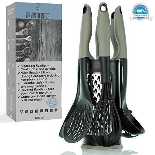 -. Feature : Cooking Utensils Chic Kitchen Utensils with stand includes - Whisk, Skimmer, Slotted Turner, Spaghetti Server, Spoon, Ladle, Plus a bonus Grater and Garlic/Ginger Rasp built into Holder. / The Perfect Gift Beautiful ergonomic weighted soft grip Handles: Built in stand keeps head above counter tops, reduces mess and increases hygiene. Heat resistant surface for up to 392 F / 200 C. BPA Free FDA Approved. / Bonus Grater and Rasp when you wish you had a spare grater/rasp at hand, fear not Arvista Chef to the rescue, you can rely on these dependable tools / Love Your Kitchen, Look great in any kitchen and super easy to clean, you can either hand wash them with soap and warm water or add them to your next dishwasher load for hassle-free clean up! / Customer Satisfaction Guaranteed We love our customers and will do everything to guarantee your satisfaction, if for any reason you are unhappy with our product we will offer a full refund - no questions asked