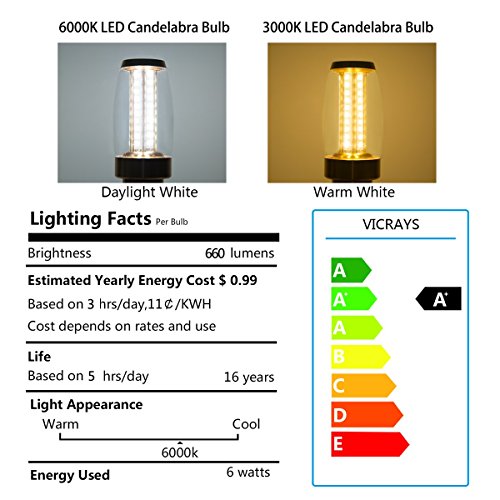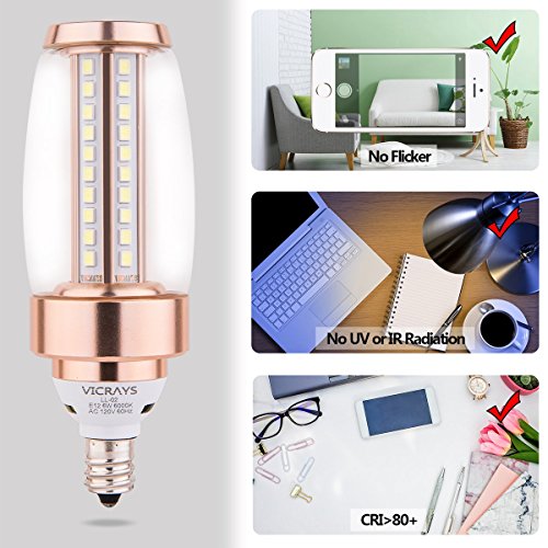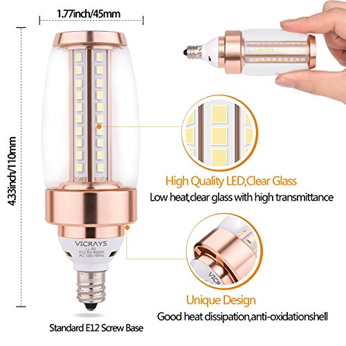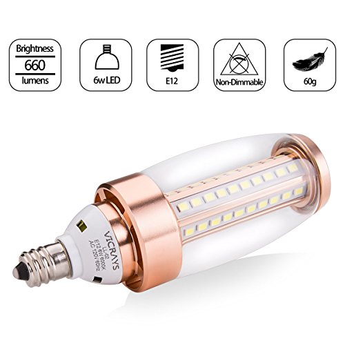 Specifications: Condition: Brand new Lamp Base: E12 (candelabra) Luminous: 660 lm(60W bulb equivalent) Dimmable: Non-dimmable Color Temperature: 6000K (Daylight White) Material: Aviation aluminum base Input Voltage: 110V-130V Beam Angle: 360 degree Lifespan: 30,000 hours Light Source: High Brightness 2835 SMD chips CRI>80Ra