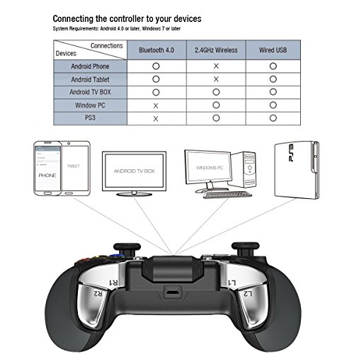 ✔ Compatible with Android 4.0 and up devices, such as smartphone, tablets, smart TV, TV BOX. Windows 10/8.1/8/7/Visa PC, as well as the Samsung Gear VR and other android OS VR, support thousands of controller-enable games. Three main connections: Bluetooth 4.0, 2.4GHz wireless USB dongle and wired.