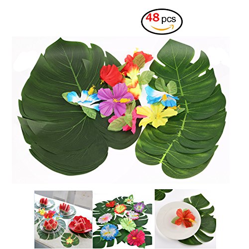 Party Tropical Leaves, 48 PCS Artificial Plant Leaves,Monstera Palm Leaves Decoration,Polyester Leaves and Flowers Plants Supplies for Birthdays(big leaves 12pc+ small leaves 12pc +flowers 24pc)