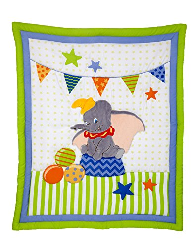 Dumbo is the star of the circus in the Disney baby Dumbo 3 piece crib bedding set. Includes an appliqued comforter, fitted crib sheet, and dust ruffle. Made from soft 100% polyester microfiber for an extra soft feel. Comforter measures 42 x 33". Sheet fits a standard size 28 x 52" crib mattress.Feature