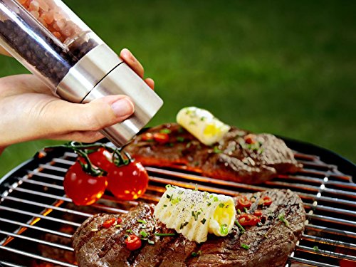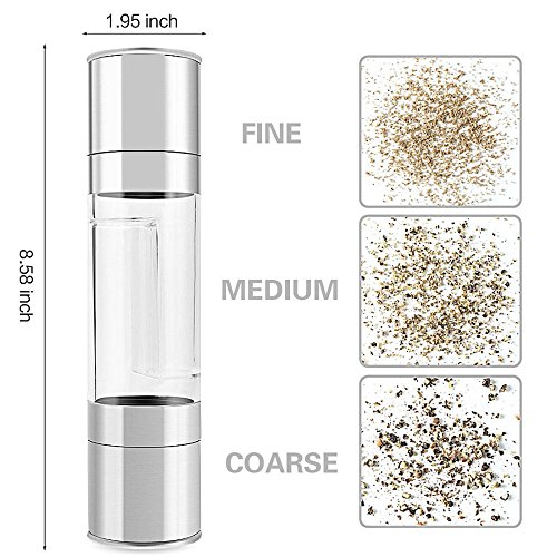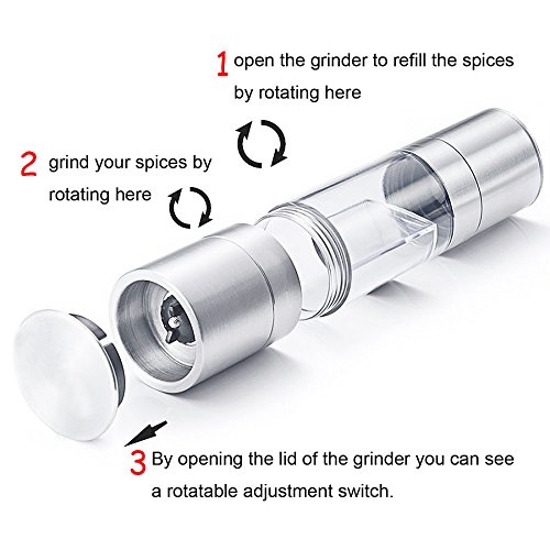 - SIMPLE AND EASY TO USE: The Acrylic containers help check the quantity and refill quickly. No messing with the steel cap! The adjustable rotor can adjust the size of grinding from fine to coarse. Just few effortless rotation with your hands and you can experience the fresh ground salt, pepper or any other spices.