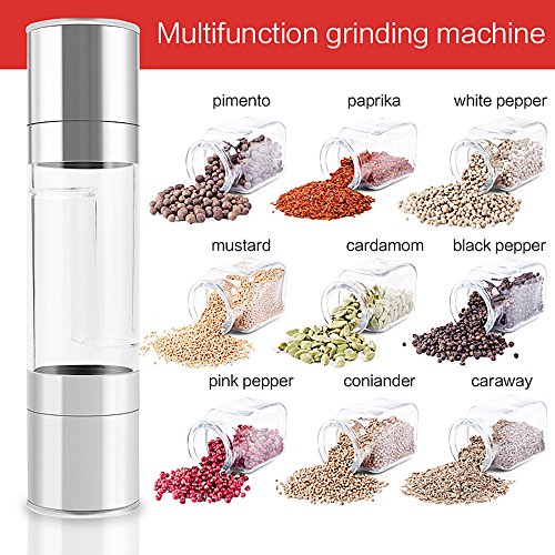 - 2 IN 1 SALT & PEPPER PURE CERAMIC MILL: Utility & Practical Chambered design for space saving. It takes up less space to grind both salt and pepper on your counter. 2 In 1 Salt and Pepper Grinder is a perfectly designed multi-purpose mill for grinding peppercorns, salt and other spices. Why bother purchasing salt and pepper mills shakers respectively? Now, THIS IS IT.