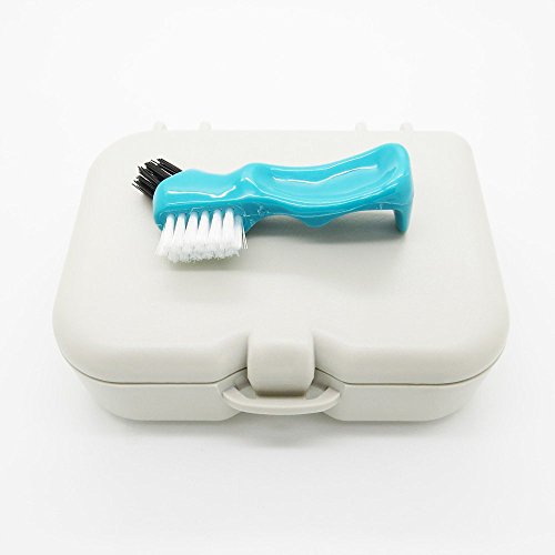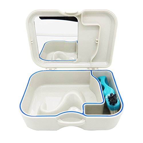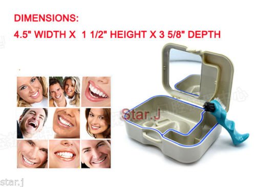 -. Feature : Dental Orthodontic Mouthguard Retainer Case Box with Mirror Brush / One plastic denture retainer box with 1 mirror and 1 cleaning brush. / Tan with blue brush. Easy to open with thumb release clap / Made of heavy duty reinforced ABS-POLY-CARBONATE / Exterior dimensions: 4.5" WIDTH X 1 1/2" HEIGHT X 3 5/8" DEPTH