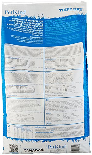 原材料:ラムトライプ、七面鳥、エンドウ豆、七面鳥ミール、エンドウ豆タンパク、キャノーラオイル(ローズマリー抽出物による保存処理)、亜麻仁、ナチュラルフレーバー、キノア、カボチャ、ホウレンソウ、ニンジン、ブロッコリー、クランベリー、りんご、ブルーベリー、バナナ、炭酸カルシウム、塩化ナトリウム、リン酸二カルシウム、塩化カリウム、サーモンオイル(混合トコフェロールによる保存処理)、チコリ根、塩化コリン、ビタミン(ビタミンA、ビタミン D3、ビタミンE、ナイアシン、パントテン酸カルシウム、リボフラビン、硝酸チアミン、塩化ピリドキシン、葉酸、ビタミン B12) 、ミネラル(硫酸亜鉛、硫酸鉄、亜鉛タンパク化合物、鉄タンパク化合物、硫酸銅、酸化マンガン、銅タンパク化合物、マンガンタンパク化合物、ヨウ素酸カルシウム、亜セレン酸ナトリウム)、タウリン、乾燥ラクトバチルス・アシドフィラス発酵物、乾燥ラクトバチルス・カゼイ発酵物、乾燥ビフィズス菌ビフィダム・サーモフィラム発酵物、乾燥ストレプトコッカス・フェシウム発酵物、ユッカシジケラ、ローズマリー、トウガラシ、ペパーミント、タイム、緑茶抽出物
