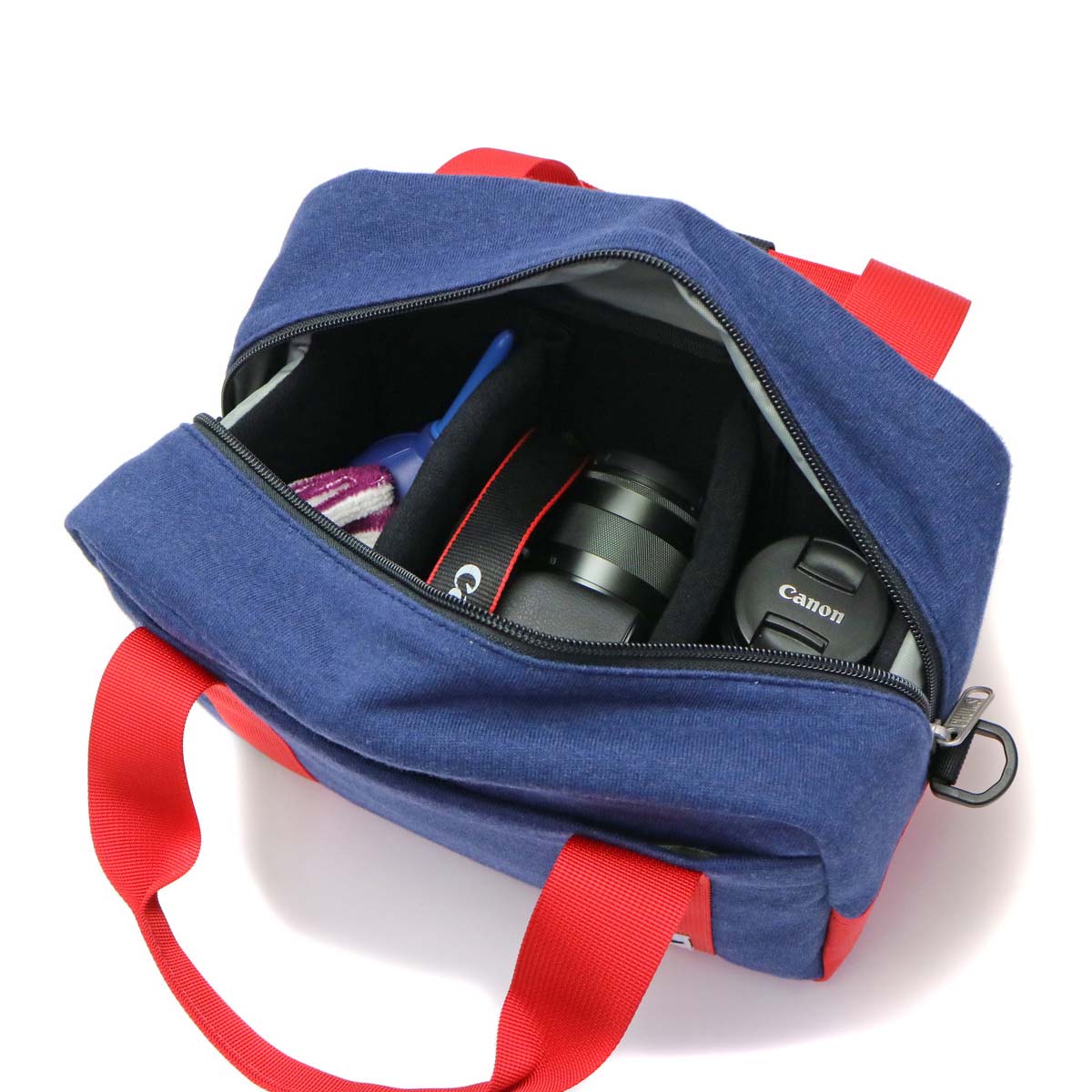 It is a combination material of sweat and nylon, 2-way camera Boston with a cute 2 tone color point. It can store single lens reflex cameras and can be used widely ranging from sightseeing tours to events such as athletic meet.
