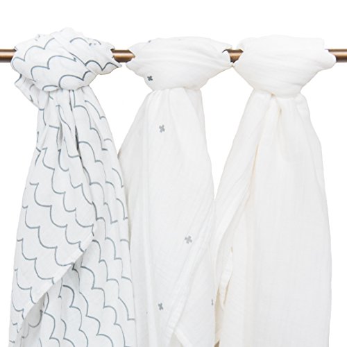 Muslin Baby Swaddle Blankets, 44x44 (3 Pack) White, Plus - Pluses - Cross - Crosses, Waves, Grey/White, Small Winks - Muslin Swaddle Blankets - Baby...