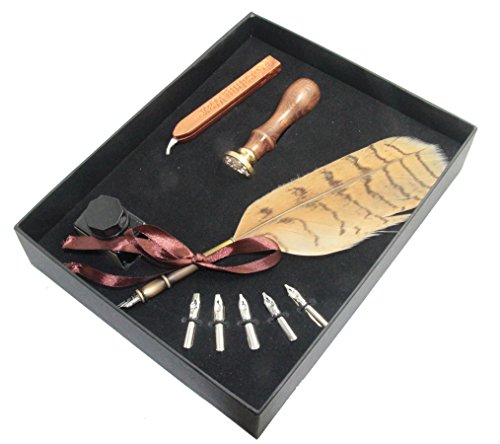 item includes:1 pen(approx 22cm length),1 empty ink bottle(as custom rule,ink can't be passed,so we have to put empty bottle),5 pcs different sizes pen nibs,1 pc Wax Seals,1 pc red golden sealing wax