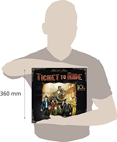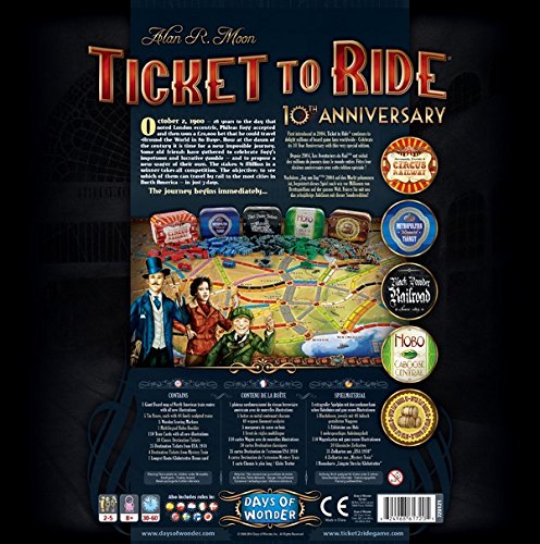 First introduced in 2004, Ticket to Ride has continued to delight millions of board game fans worldwide. This year the award-winning train adventure game turns 10 years old and it's time to celebrate with this very special Ticket to Ride 10th Anniversary Edition! The Ticket to Ride 10th Anniversary Edition comes in an oversize game box featuring new cover design and graphics. It includes a giant US board map that is 50% larger than the original. It still uses the classic US routes, but with new illustrations and design. There are 5 sets of finely sculpted custom plastic trains, each featuring a different type of train car and unique paint scheme reminiscent of toy trains of yesteryear. These are nestled in 5 tin train storage boxes, each with their own custom logo and artwork matching the trains' rail line. Added to the mix are 110 large format Train cards and 69 Destination Tickets (the original US map tickets, PLUS those from the 1910 expansion) and a new multi-lingual rules book in 12 languages. This special 10th Anniversary Edition is a "must-have" for Ticket to Ride fans. The game play remains faithful to the original classic US map version - but the new design, illustrations, oversized map and especially the new custom trains and tin storage boxes - take the Ticket to Ride experience to a whole new level. Game Contents: Oversized Game Box (14.2 x 14.2 x 3.15 Inch) with new 10th Anniversary design, Giant Board map of North American train routes with all new illustrations (38 x 25.5 Inch), 5 sets of 48 newly designed, larger custom plastic trains - each colored set featuring a different design, 5 Tin Train storage boxes with custom logo and artwork of different train companies, 110 large sized Train Cards with all new illustrations, 69 Destination Tickets (original Tickets, plus those from 1910 expansion), 5 Large Wooden Score markers, One multilingual rules booklet in 12 languages.Feature