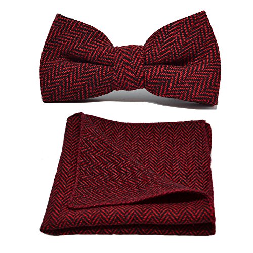 Stylish cranberry red and black bow tie and pocket square set in a premium, soft Herringbone fabric. Bow tie is adjustable to a neck size of up to 19" with metal hook eye fastening. Pocket Square measures approximately 25cm x 25cm. Forms part of the King Priory Herringbone Collection. Matching tie also available. 0