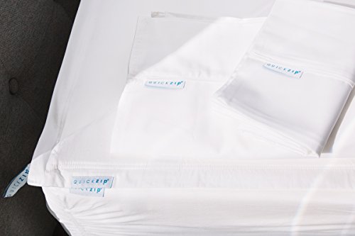 -. Feature : FITTED SHEETS REINVENTED - QuickZip is a patented two-piece fitted sheet that easily zips off and on. To get started, you'll need a Fitted Base and at least one Zip-On Sheet. Our Premium Starter Pack includes (2) Zip-On Sheets and (1) Fitted Base = 2 Fitted Sheets for one mattress / Our 400-THREAD-COUNT Luxurious SATEEN Cotton Zip-On Sheet is soft and smooth against your skin with a subtle luminous sheen / QuickZip Fitted Sheets are EASY - No more strling with lifting the mattress; FAST - Sheet zips off and on in seconds; SECURE - Base hugs the mattress and stays in place; NEAT - Easy to fold and bed skirt stays in place while changing the sheet / KEY FEATURES INCLUDE: Easy access corner zipper start location, Zipper start locator logo ribbon on both base and zip-on sheet, Large zipper pull ribbon loop, Deep pocked fitted base / SLIP ON MATTRESS LIKE A REGULAR FITTED SHEET - the fitted base stays securely on the mattress and since you're not washing the base very often, it will last longer and stay put
