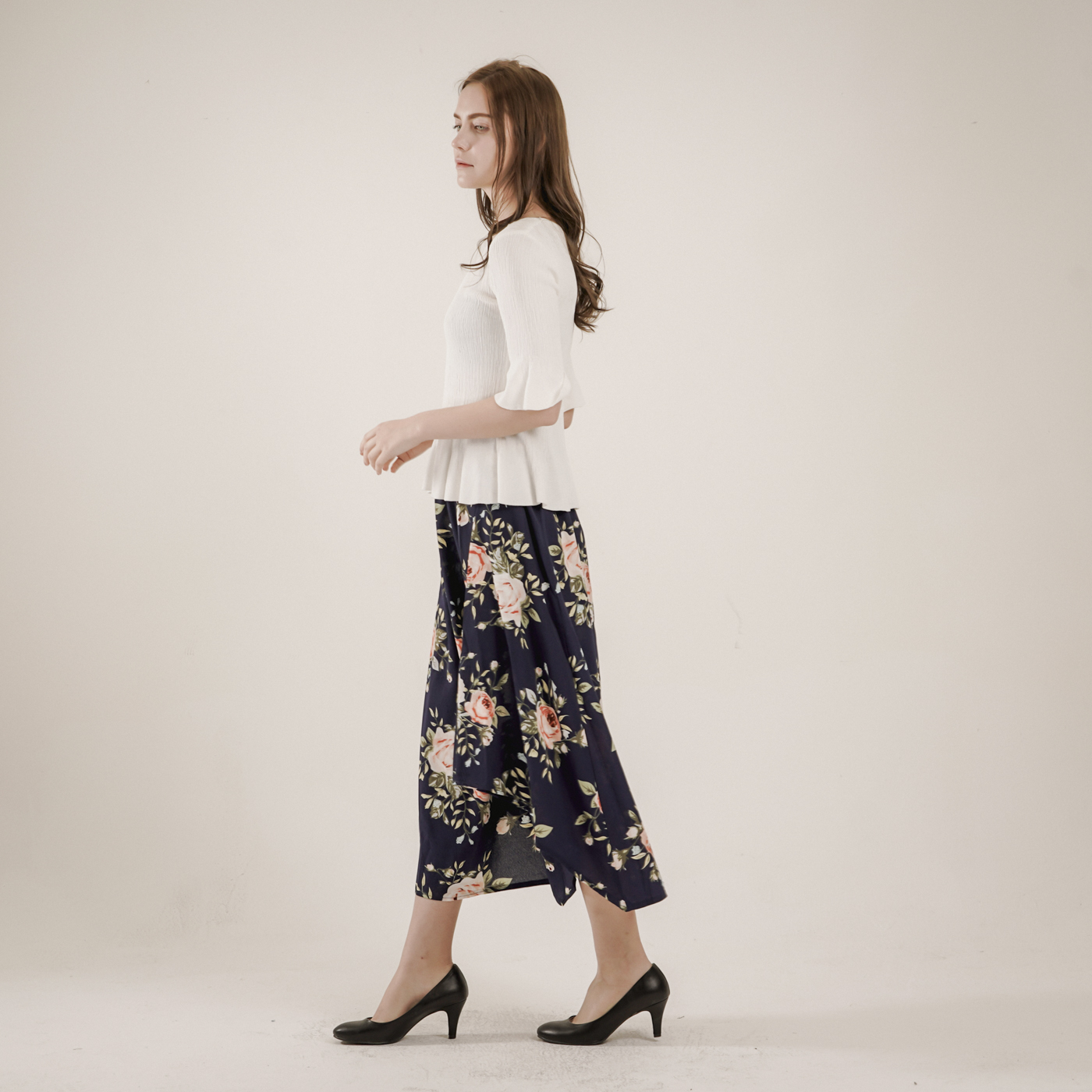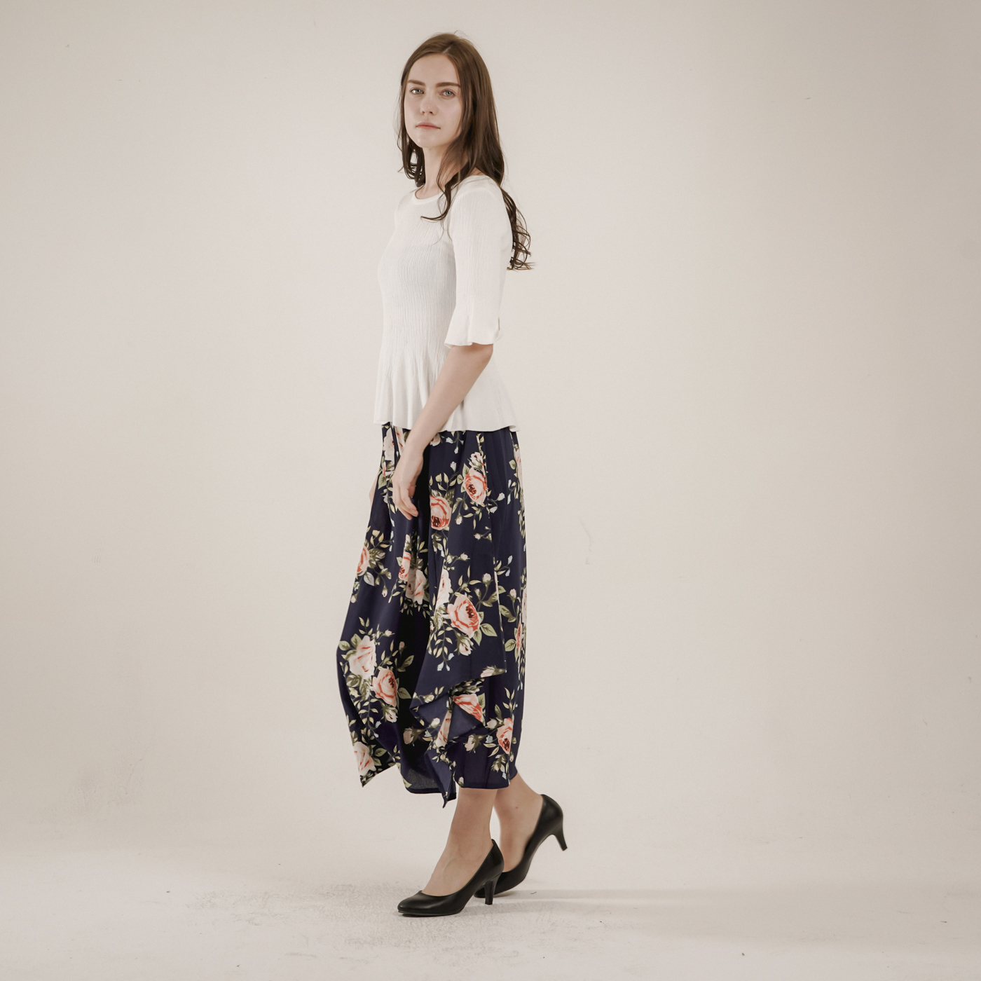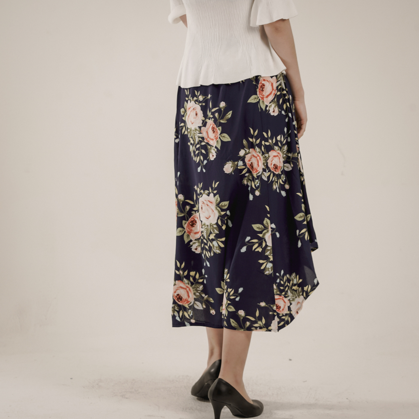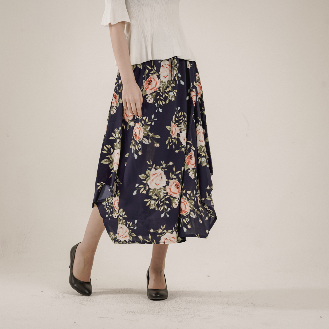 빅로즈 패턴의 컬러감이 예쁜 스커트로 밑단의 컷팅도 멋스런 디자인입니다.