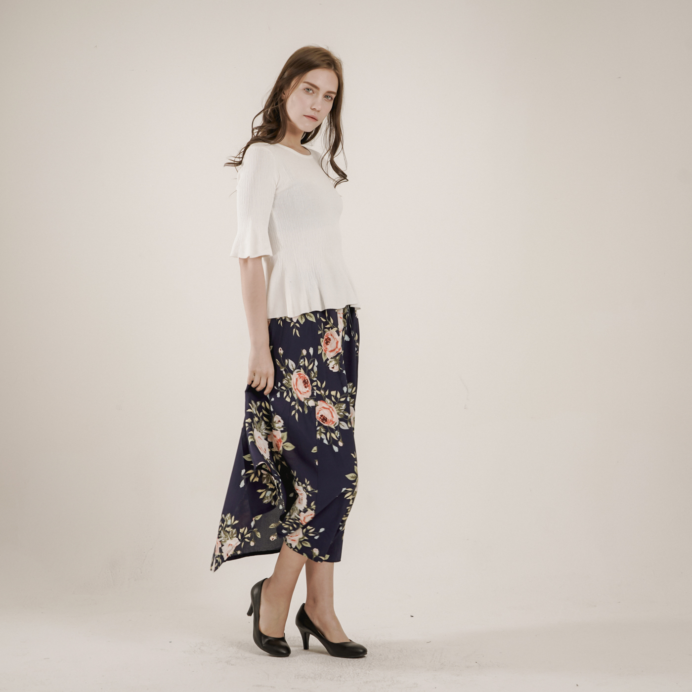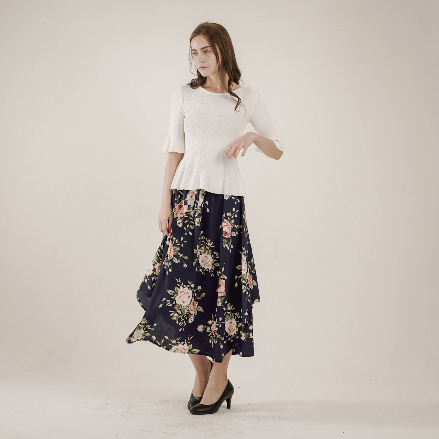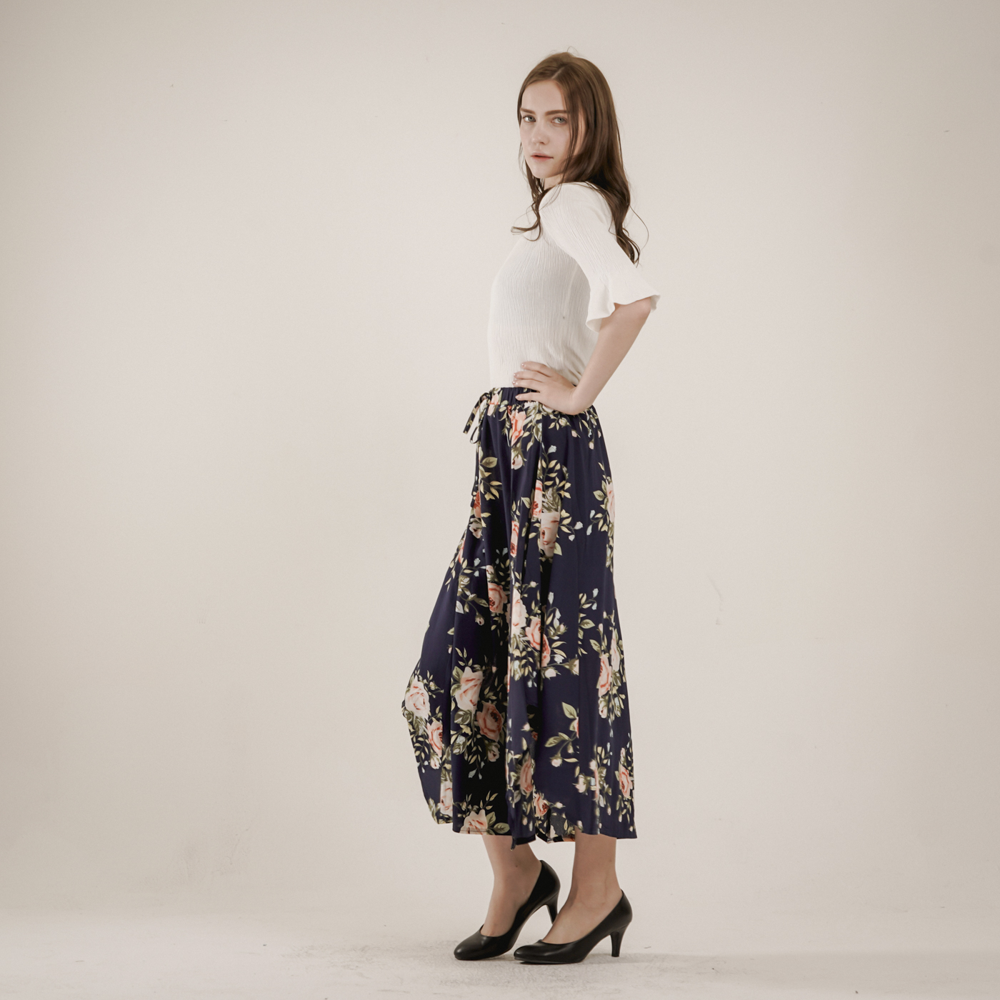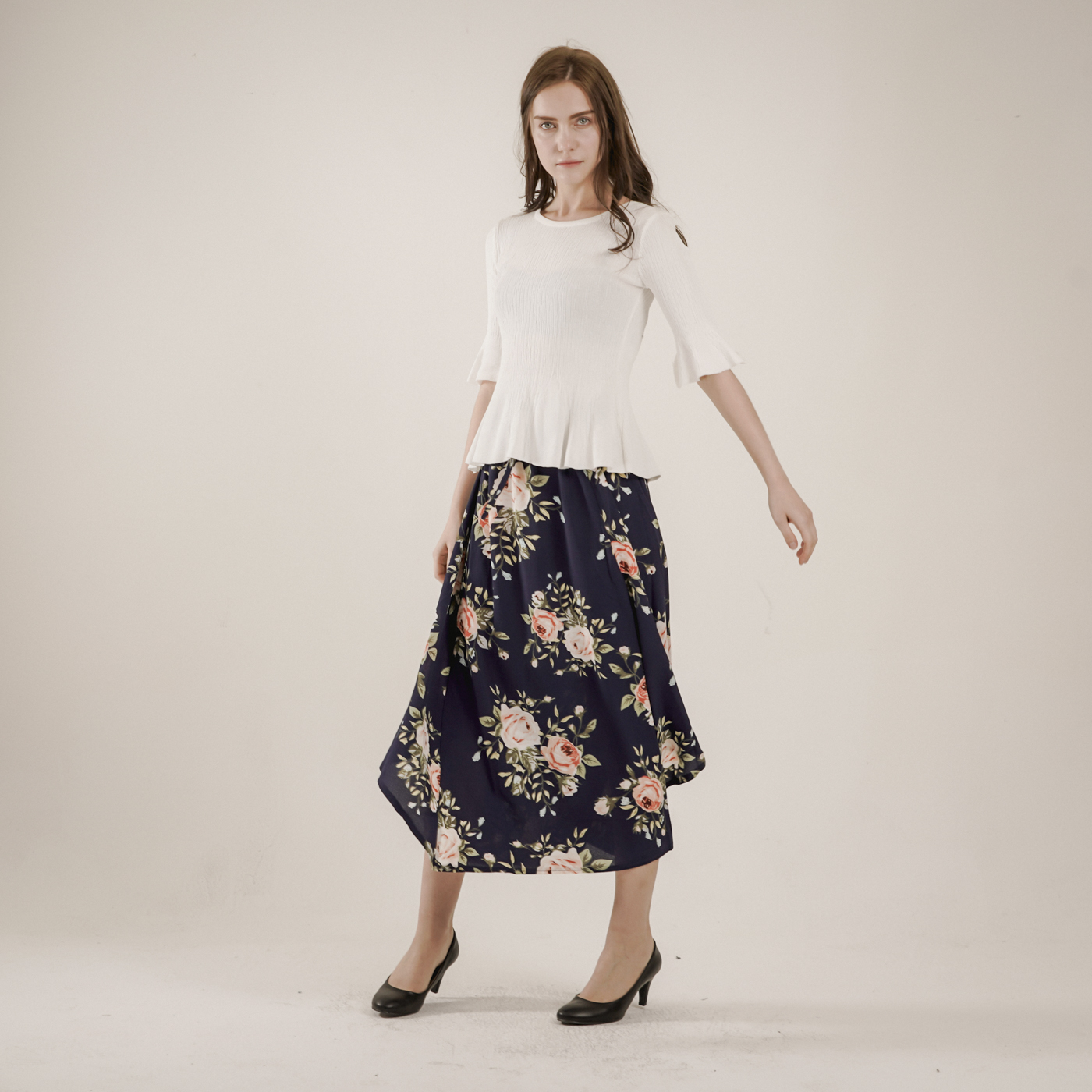 빅로즈 패턴의 컬러감이 예쁜 스커트로 밑단의 컷팅도 멋스런 디자인입니다.