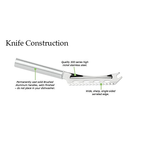 BRUSHED ALUMINUM HANDLE - The handle on the cheese knife is made from permanently cast silver brushed aluminum with a satin finish. This serving knife should not be washed in the dishwasher. Handwashing is recommended.