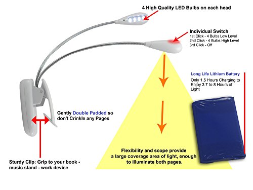 READ UNINTERRUPTED (you don't need to rearrange the arms); enjoy the MALLEABILITY and FIRMNESS of each gooseneck and the SUPER BRIGHT 8 LED bulbs that will cover BOTH PAGES.