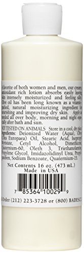Creamy, rich, olive oil based lotion restores lost moisture and leaves the skin feeling soft and silky without being greasy. Quickly absorbing with minimal fragrance so it is perfect for both men and women. A must after bath or sun to revitalize dry skin.Feature