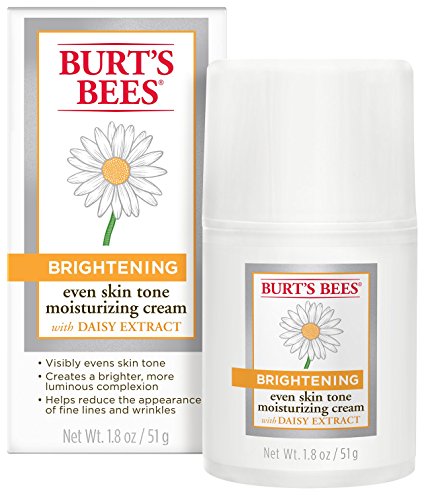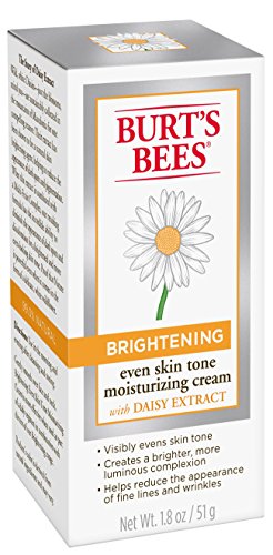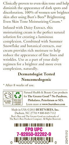 Create a brighter, more luminous complexion while diminishing the appearance of dark spots and discoloration with Burt's Bees Brightening Even Skin Tone Moisturizing Cream. This rich facial moisturizer hydrates dry skin and is clinically shown to even skin tone and help diminish the appearance of dark spots and discoloration. 100% of women saw brighter skin after 8 weeks of use. Formulated with a combination of summer snowflake and botanical extracts, this 99% natural face lotion provides rich moisture to help reduce the appearance of fine lines and wrinkles. It's dermatologist tested, noncomedogenic and contains no parabens of phthalates. Use it as part of your daily regimen for brighter, more even-toned skin, naturally. Put the power of nature to work for your skin with Burt's Bees.Feature