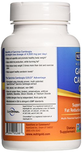 -. Binding : Health and Beauty -. Brand : Nutrigold -. EAN : 0859447002883 -. Feature : The Gold Standard Clinically-Proven SuperCitrimax® Garcinia Cambogia Extract with 5 U.S. Patents / Features 60% HCA bound to Potassium/Calcium Salts in a patented ratio proven to work for weight-loss / 1,000 mg per capsule ~ 90 vegetarian capsules per bottle ~ That's a full 30 day supply at the dosage of 3000 mg per day (3 caps per day) / Beware of other Garcinia products that advertise 1,000 mg "per serving" that are actually 500 mg "per capsule" / Supports appetite control, aids to burn fat, and helps loose weight 3 times more than diet and exercise alone* -. IsAdultProduct : 0 -. Label : NutriGold -. LegalDisclaimer : ONLY SuperCitrimax® Garcinia Cambogia Extract has been granted several US patents with more patents pending worldwide. Garcinia Cambogia Gold contains only the SuperCitrimax® 60% HCA extract which has been clinically studied over the last two decades in leading US universities and has a proven track record of safety and "approved" weigh-loss claims based on its proprietary extract which is "bound" to Potassium and Calcium in a specific patented ratio. Avoid the brands on amazon claiming "multi-patented" extracts but are not using SuperCitrimax® because that is blatant fraud. Trust the NutriGold® purity and potency guarantee. We use only clinically validated ingredients to make our products and NEVER make products like Raspberry Ketones or African Mango that are popular in the media and frequently requested by our customers but not proven to work on humans at all. Trust NutriGold® - the GOLD standard in nutritional supplements. -. Manufacturer : NutriGold -. MPN : Garcinia Cambogia Extract Pure -. PackageQuantity : 1 -. PartNumber : Garcinia Cambogia Extract Pure -. ProductGroup : Health and Beauty -. ProductTypeName : HEALTH_PERSONAL_CARE -. Publisher : NutriGold -. Studio : NutriGold -. Title : Nutrigold - Garcinia Cambogia Extract 100% Pure - 90 Capsules -. UPC : 859447002883
