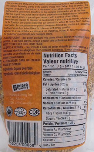 Honey Bunny's Certified Organic Bee Pollen is produced in the pristine Peace River region of Northern Alberta, Canada. This pollen consistently has very nice texture and taste with a wide variety of colors, although no batch is ever the same! Now you can feel good knowing that you're consuming an award winning pollen that is produced organically!Feature