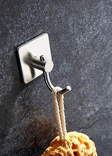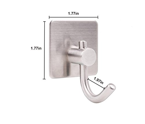 - 4.With a minimalist and engaging design,match nicely with existing stainless hardware in bathroom/kitchen,etc,self adhesive hooks are more convenient and easy to install than the screw into the wall one,no drilling, no tools,no damage to the wall. Just clean the surface, place the hook in your desired location, peel off the backing and press.