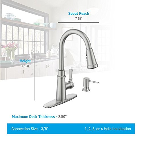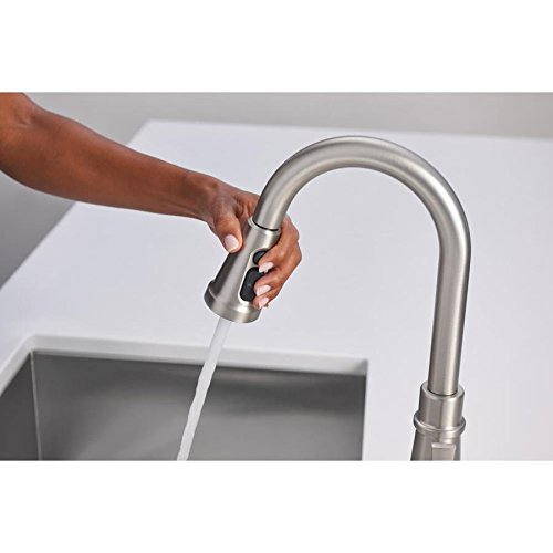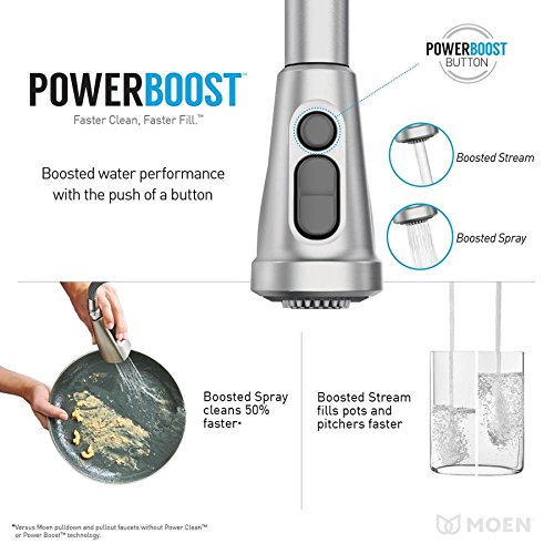 Boosted spray provides 50% more spray power versus Moen pulldown and pullout faucets without Power Clean™ or Power Boost™ technology Available in Moen’s exclusive Spot Resist™ Stainless finish, which resists fingerprints and water spots to maintain the faucet’s brilliance