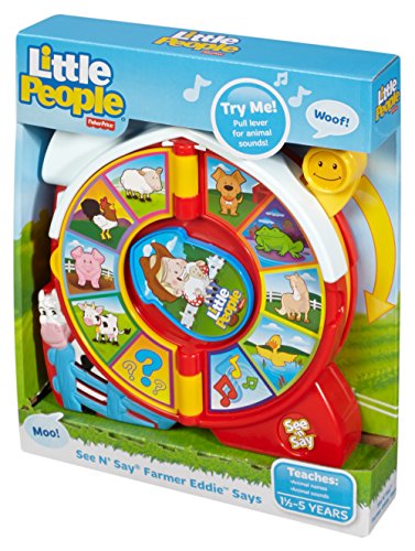 Classic fun for kids with a Little People spin! Little People farm animals are teaching kids their names and sounds in a classic way-it's See 'n Say! Point the arrow on the Little People See 'n Say at an animal, and pull the lever down to hear its name and what it says. Once kids give it a spin, they won't want to stop!Feature