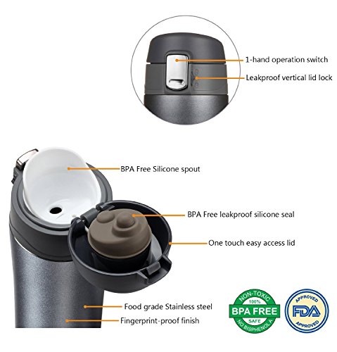 - EASY TO CARRY ON THE GO - Spill proof lid keeps your drink safely inside, and the leak proof bottle shape allows the bottle to easily fit into your cup holder! Plus, the double walls prevent condensation, so your fingers stay dry. Making this stainless steel water bottle thermos a must have accessory for the gym, work, car, hiking, camping, outdoors, yoga, crossfit, tennis, the beach, picnic, and travel.