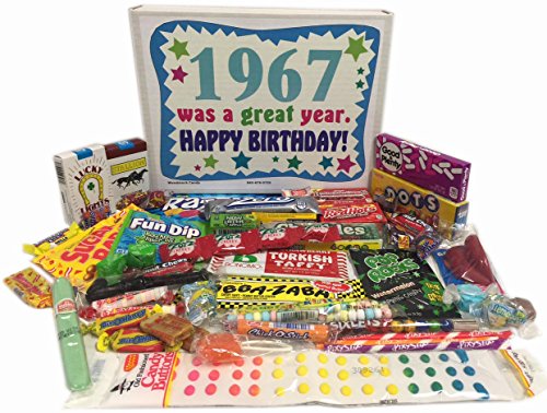 -. Binding : Misc. -. Brand : Woodstock Candy -. Feature : Makes a fun and unique 50th birthday gift for someone born in 1967 / Perfect for the person who has it all / Everyone loves candy from their childhood! / Box reads "1967 was a great year. Happy Birthday!" / Comes shrink wrapped in a box that measures 11.75" x 9" x 2" -. IsAdultProduct : 0 -. Label : Woodstock Candy -. Manufacturer : Woodstock Candy -. PackageQuantity : 1 -. ProductGroup : Grocery -. ProductTypeName : GROCERY -. Publisher : Woodstock Candy -. Studio : Woodstock Candy -. Title : 50th Birthday Gift for Women and Men - Retro Candy Box Assortment from Childhood - 50 Years Old - Born in 1967