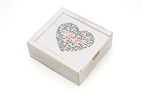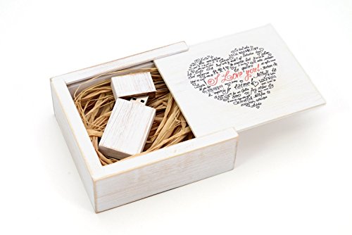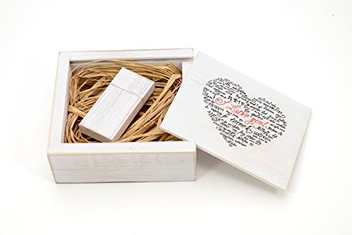 Antique Maple 8GB USB Flash Drive - Stained in Wedding White - Inserted into a Printed Matching Maple Stained Box with Raffia grass inside. Calligraphy Heart Design