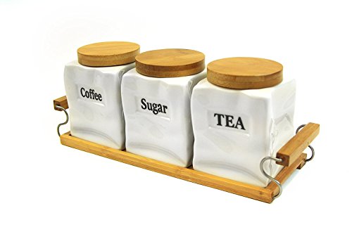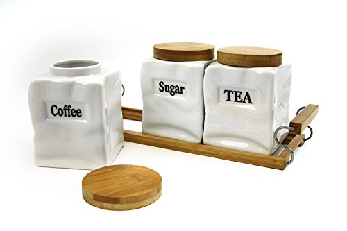 Attractive Set of Three (3) Square Canisters with Natural Bamboo Lid and Stand - Stone Design Coffee, Tea, Sugar, Ceramic Canister Set