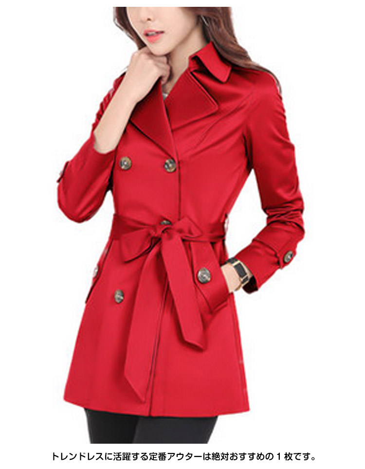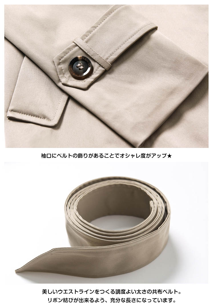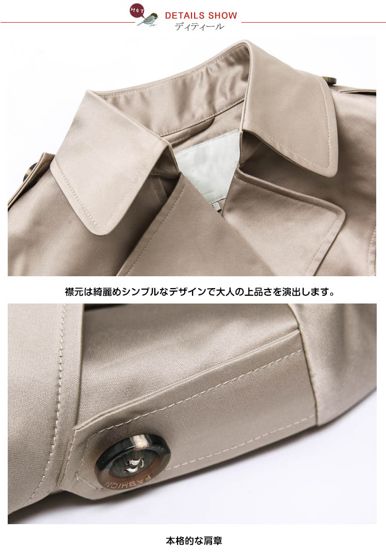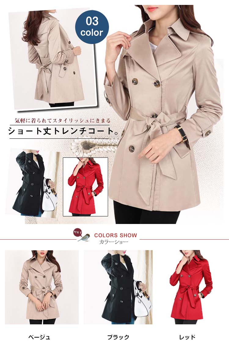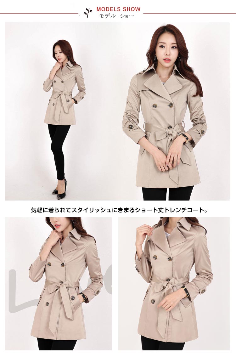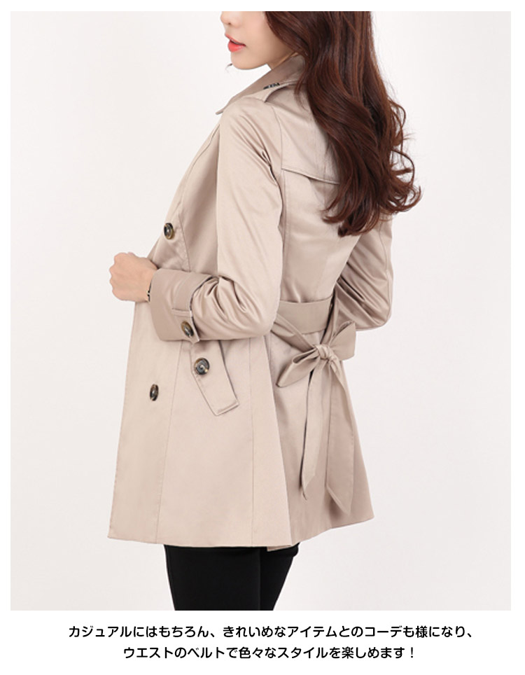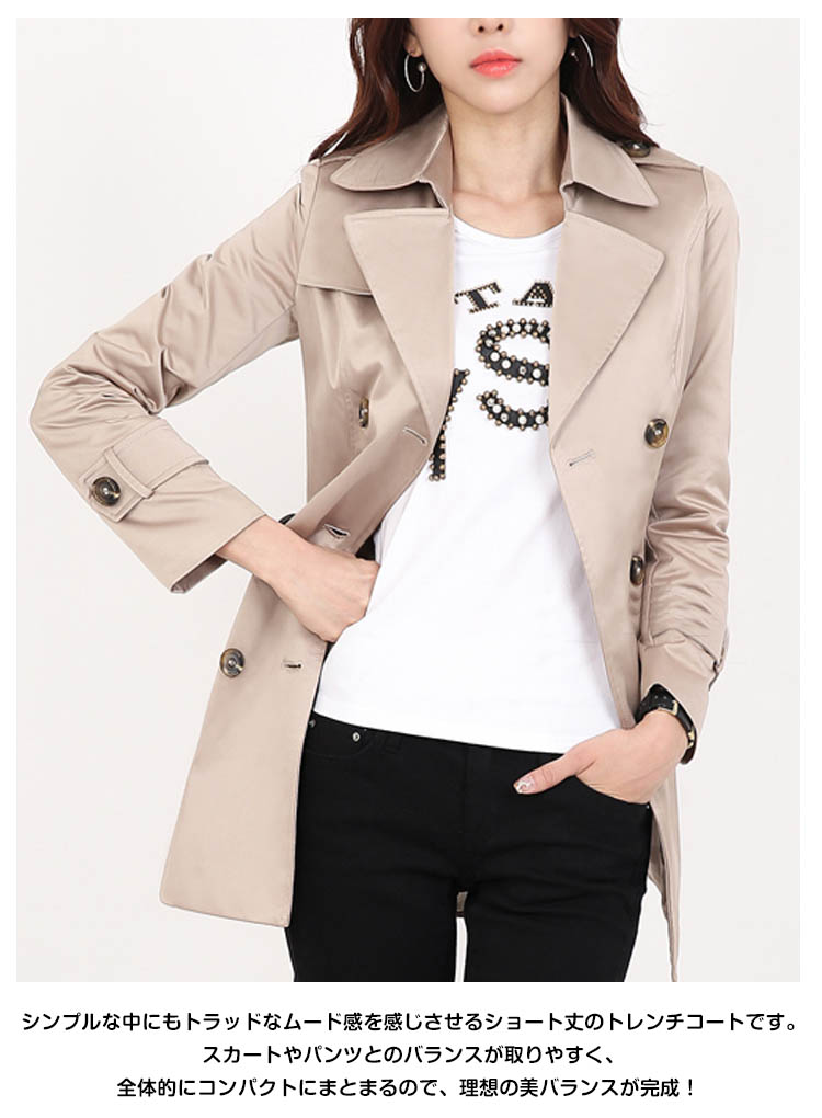 | 気軽に着られてスタイリッシュにきまるショート丈トレンチコート。シンプルな中にもトラッドなムード感を感じさせるショート丈のトレンチコートです。スカートやパンツとのバランスが取りやすく、全体的にコンパクトにまとまるので、理想の美バランスが完成!カジュアルにはもちろん、きれいめなアイテムとのコーデも様になり、ウエストのベルトで色々なスタイルを楽しめます!トレンドレスに活躍する定番アウターは絶対おすすめの1枚です。 | |