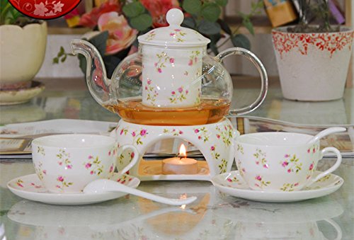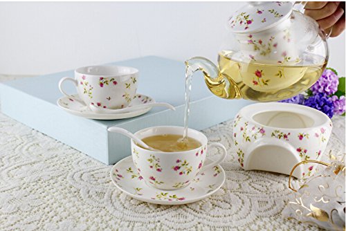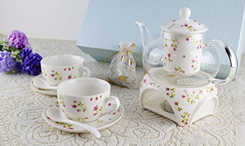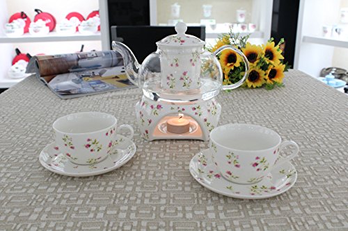 - Feature : This beautiful tea set comes with a 27 oz teapot with a removable Porcelain filter cup, a Porcelain teapot warmer, and 2 porcelain tea cups and 2 saucers and 2 spoon / All pieces are made entirely of heat resistant borosilicate glass and porcelain. Good for hot, iced tea, coffee (bag cofee) brew; Elegant and modern design. / The roomy removable filter allows tealeaves to expand and provide full infusion of the leaves. / It is easy to brew loose tea. Just put the tea into the inner cup and add some water, then the inner cup releases infused tea directly into the outside teapot. / The tea warmer cozy can fit most teapots. Showpiece of traditional Chinese craftsmanship,Brings efortless elegance and beauty to your kitchen.Dishwasher Safe, Not safe in microwave