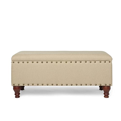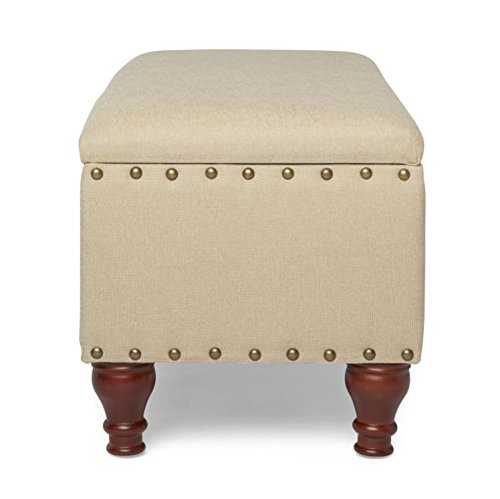 -. Feature : Bench with decorative turned legs / Decorative nail head trim / Safety hinged lid / Materials: Wood, foam, fabric, Finish: Espresso, Upholstery color: Tan / Upholstery fill: Foam, Dimension: 18 inches high x 42 inches wide x 18 inches deep