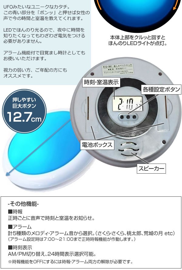 | 仕様 | 電源:単4乾電池×2本(別売) デジタル時計(月差±50秒) 温度計 アラーム 正時時報 音声お知らせ機能(時刻・室温) |