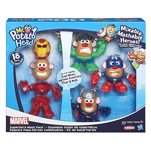 -. Binding : Toy -. Brand : Playskool -. Color : Multi -. Department : unisex-child -. EAN : 0630509330850 -. Feature : Mr. PotatoHead Marvel Mixable, Mashable Heros! toys. / Set includes potato bodies and parts to build Captain America, Iron Man, hulk and Thor / Parts are compatible with other MR. POTATO HEAD (sold separately) / Perfect for ages 2+ / Includes - 4 potato bodies, 4 characters' torsos with arms, 3 character helmets, 1-character hairpiece, 4 character bases, 1 cape & hammer -. Genre : Action -. IsAdultProduct : 0 -. Label : Playskool -. Manufacturer : Playskool -. Model : B3458 -. MPN : B3458 -. PackageQuantity : 1 -. PartNumber : B3458 -. ProductGroup : Toy -. ProductTypeName : TOYS_AND_GAMES -. Publisher : Playskool -. Studio : Playskool -. Title : Mr. Potato Head Marvel Mixable Mashable Heroes Super Hero Collector Pack (Avengers) -. UPC : 630509330850