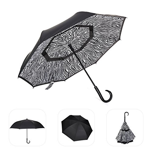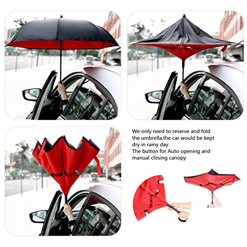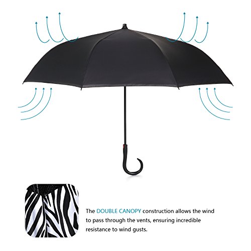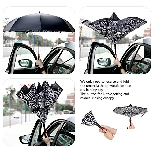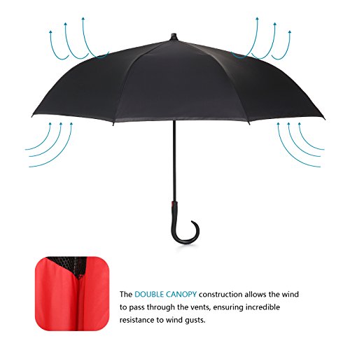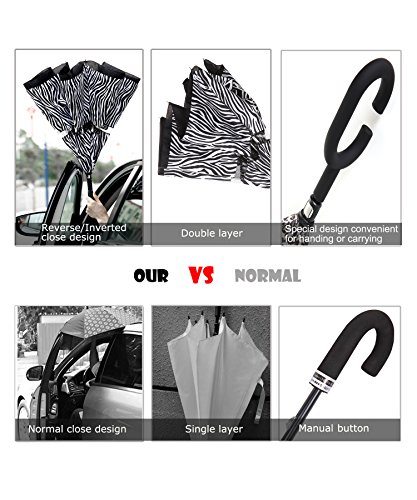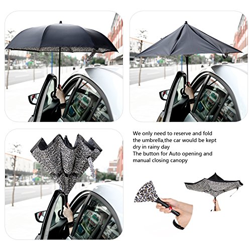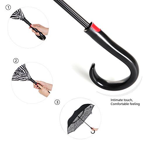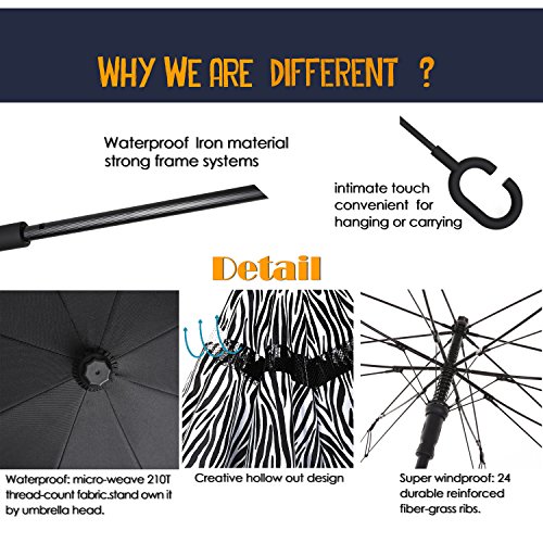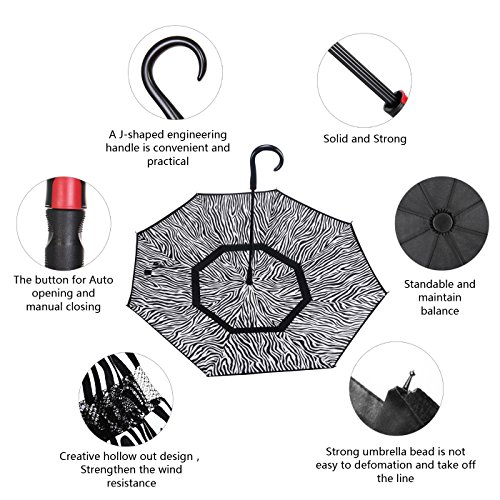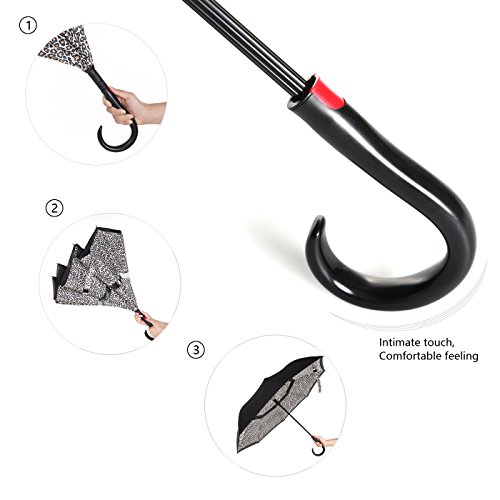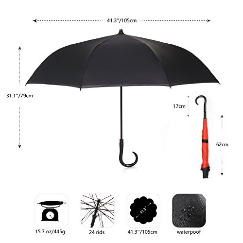 Innovative Design Help You Solve These Problems : Automatically Open : one second - one hand operation, very convenient. J-shaped Hand Grip :Increase radians , easy holding an umbrella with your wrist, you can feel free your hands to make a phone call, to play with your cell phone, to hold a baby. Dual Layer Design :Successfully preventing car seat from getting wet, avoiding making others' clothes wet when stand close on the bus or subway. Stand up on its own :Easy to place, it can stand up by you on its own when closed, saving much space for you. Water Resistant :The canopy is made from premium micro-weave 210T thread-count fabric , waterproof. That is coated with teflon water repellant treatment. Wind Proof : The frame is fortified with 24 ribs that is made of premium fiberglass and high quality stainless steel.