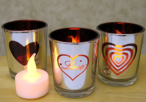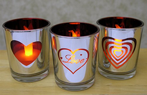 Banberry Designs Heart and Love Candles - Set of 3 Silver Metallic Votive Candle Holders - 3 White Flameless Tealight