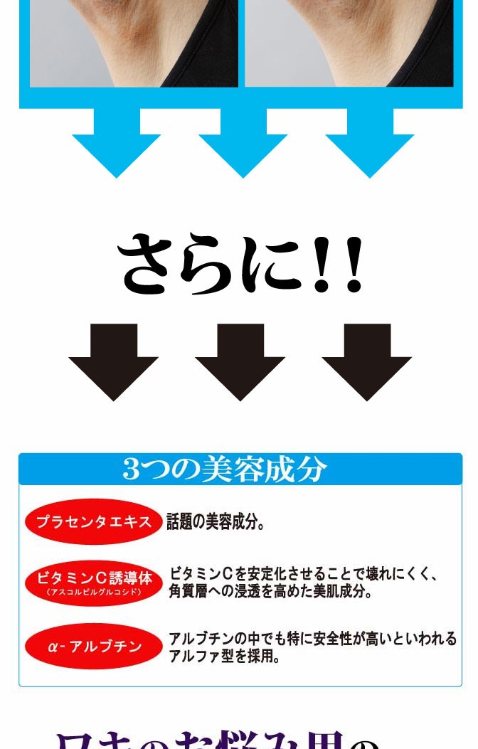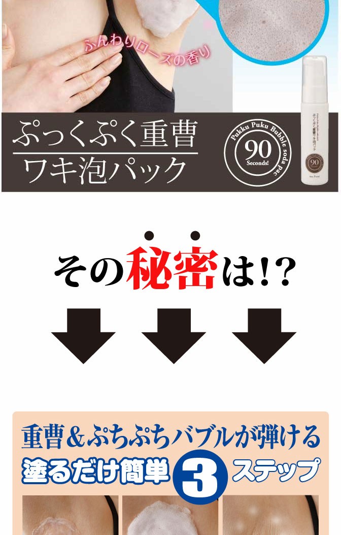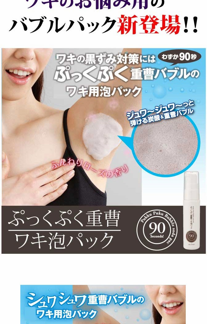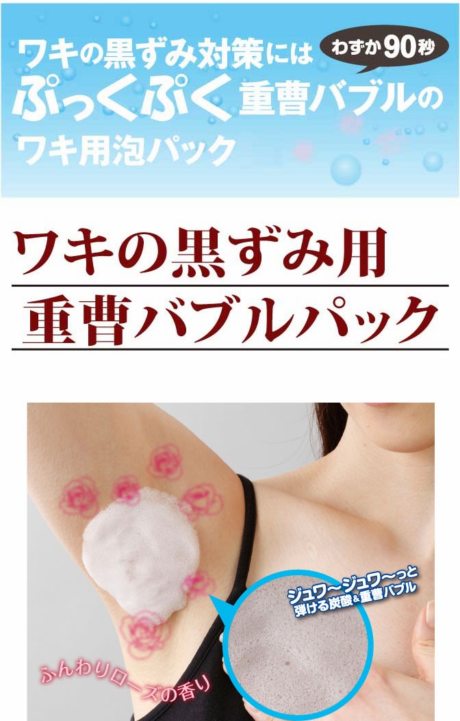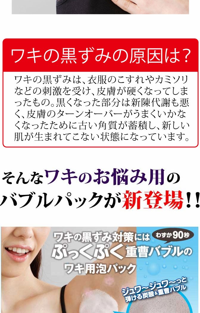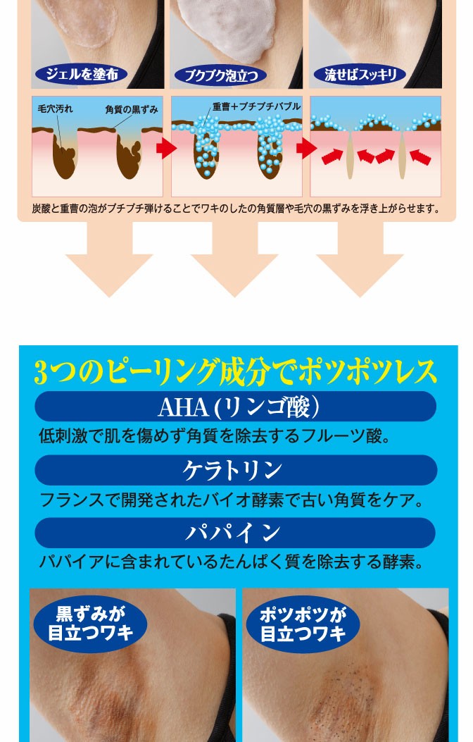 炭酸と重曹の泡がプチプチ弾けることでワキの古い黒ずみや角質を浮き上がらせます!!