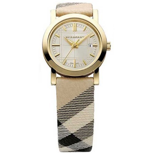 Studio : Burberry Publisher : Burberry Binding : Watch Product Description A look as classic as the name in timeless stainless steel and signature check leather. Swiss analog movement Water resistant up to 5 ATM/50m Stainless steel with gold IP (ionic plating) round case, 28mm (1.10inch ) Check etched dial Date display at 3 o'clock Second hand Golden markers Leather strap, 16mm (0.63inch ) Made in Switzerland 0