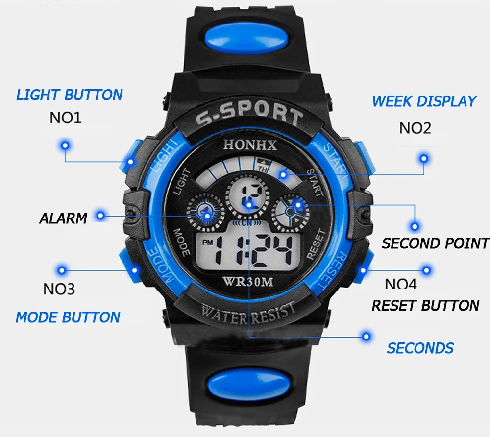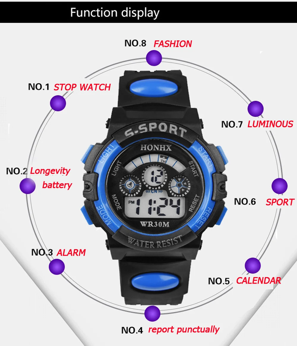 Feature:Auto Date,Complete Calendar,Shock Resistant,Week Display,Stop Watch,Back Light,LED display,Alarm,Luminous