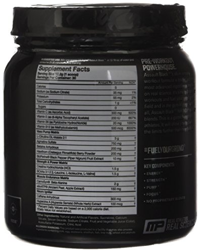 ReleaseDate : 2015-05-28 Studio : Muscle Pharm Publisher : Muscle Pharm Binding : Health and Beauty Product Description Assault Black's all-in-one pre-workout formula is loaded with the most advanced ingredients and built on real science. It's time to boost your workouts and fuel your grind on the field and in the gym or ring-best of all, Assault Black has NO Proprietary blends. This is a game changer for athletes. It will allow you to push the limits further than ever before. 0