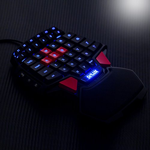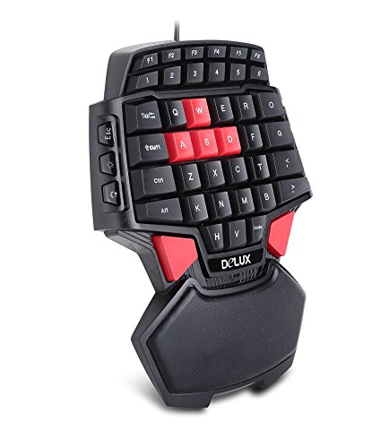 - Feature : Professional singlehanded gaming keyboard ,Ergonomic design with palm / 41 keys, 6 keys with multimedia function, Keystroke lifetime: 10 million cycles. / Simple and practical design, the volume is a palm-sized, very convenient to carry / Built in RGB 3-color backlight. You can play the game easily even if you are in the weak light. / Red Cap AWSD Keys Special For One Hand Game, Compatibility: Win 2000/Win XP / Win Visa / Win 7/ Win 8