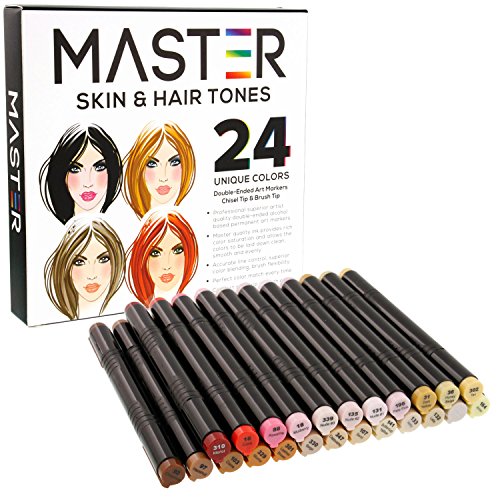 24 Color Master Markers Skin & Hair Tones Dual Tip Set - Double-Ended Art Markers with Chisel Point and Standard Brush Tip - Soft Grip Barrels - Flesh, Face, Manga, Portrait, Illustration, Sketch