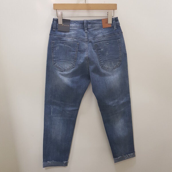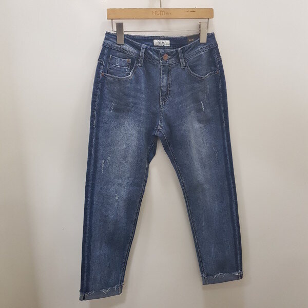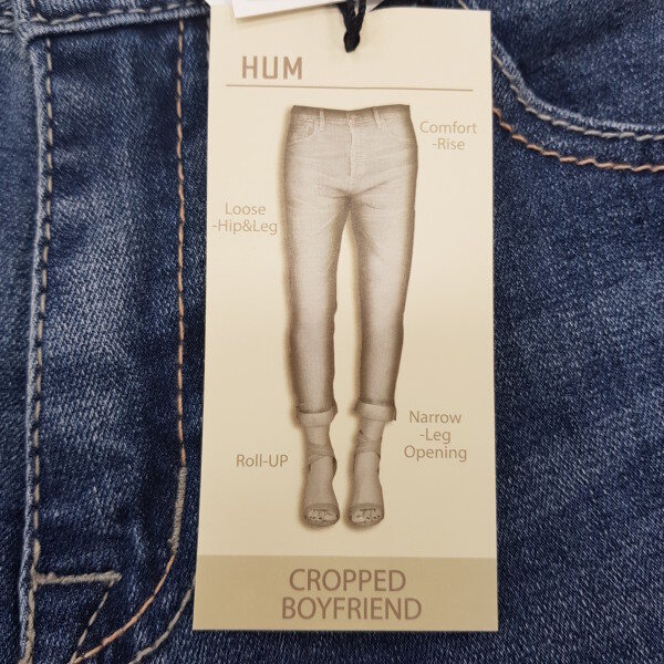 앞뒤 밑위길이가 길어 골반에 살짝 걸쳐서 루즈하게 착용하시는 보이프렌드핏입니다.밑단으로 좁아지는 실루엣으로 롤업하여 입으시길 권장드립니다.