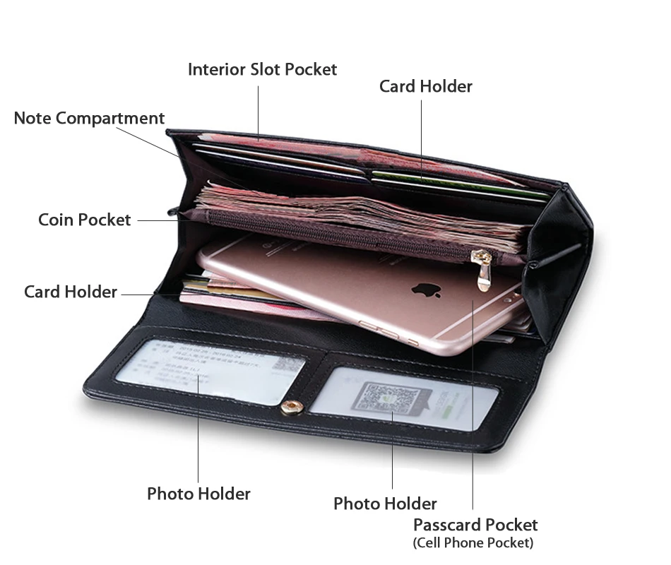 Interior:Photo Holder,Interior Zipper Pocket,Cell Phone Pocket,Interior Compartment,Interior Slot Pocket,Note Compartment,Card Holder