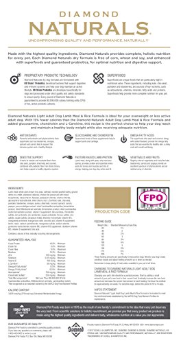 Made with the highest quality ingredients, Diamond Naturals provides complete, holistic nutrition for every pet. Each Diamond Naturals dry formula is enhanced with superfoods and guaranteed probiotics, for optimal nutrition and digestive support. Diamond Naturals Light Adult Dog Lamb Meal & Rice Formula is ideal for your overweight or less active adult dog. With 15% fewer calories than the Diamond Naturals Adult Dog Lamb Meal & Rice Formula and added glucosamine, chondroitin and L-Carnitine, this recipe is the perfect choice to help your dog reach and maintain a healthy body weight while also receiving adequate nutrition.