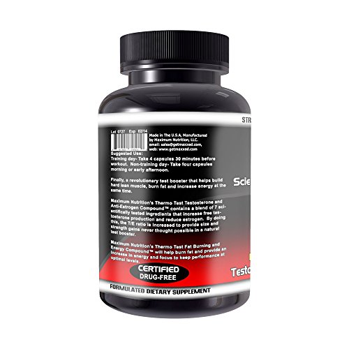 -. Binding : Health and Beauty -. Brand : Maximum Nutrition -. EAN : 0741360345010 -. Feature : Increase free testosterone levels; Increases energy and focus / Mimics anabolic testosterone effects; Thermogenic system to support metabolism / Reduces inactive testosterone levels; Increase size and strength; Increases blood flow and circulation / Reduces estrogen levels for greater T/E Ratio; Support thyroid function and digestion support / Releases fat cells so the body can break down; Helps eliminate excess water; Dramatically increase libido; Made in the USA; 120 capsules -. IsAdultProduct : 0 -. Label : Maximum Nutrition -. LegalDisclaimer : Quest Products is a drop-ship distributor for thousands of items and brands. We work directly with the Manufacturers and are their drop-ship distributor. Our items will always be brand new, never been open since we get the product directly from the manufacturers. -. Manufacturer : Maximum Nutrition -. NumberOfItems : 1 -. PackageQuantity : 1 -. ProductGroup : Health and Beauty -. ProductTypeName : HEALTH_PERSONAL_CARE -. PublicationDate : 2015-02-25 -. Publisher : Maximum Nutrition -. ReleaseDate : 2015-07-09 -. Studio : Maximum Nutrition -. Title : Maximum Nutrition Thermo Test Testosterone Booster and Fat Burning Complex, 120 Count -. UPC : 741360345010