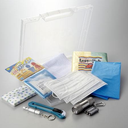 | オフィスでも場所を取らず、棚に入るA4サイズのコンパクトな防災セットを提案。ミニアルミライトは停電時などに明かりを確保できます。アルミホイッスルは体力をあまり消費せずに助けを呼べます。ファイルケースとタオルを組合わせて簡易枕に、カッターでダンボール等の裁断、レジャーシート・ポリ袋等を組合わせて簡易寝袋に。 マスクは粉塵対策に活躍します。 断水対策に携帯トイレ2~4回分を確保できます。 |